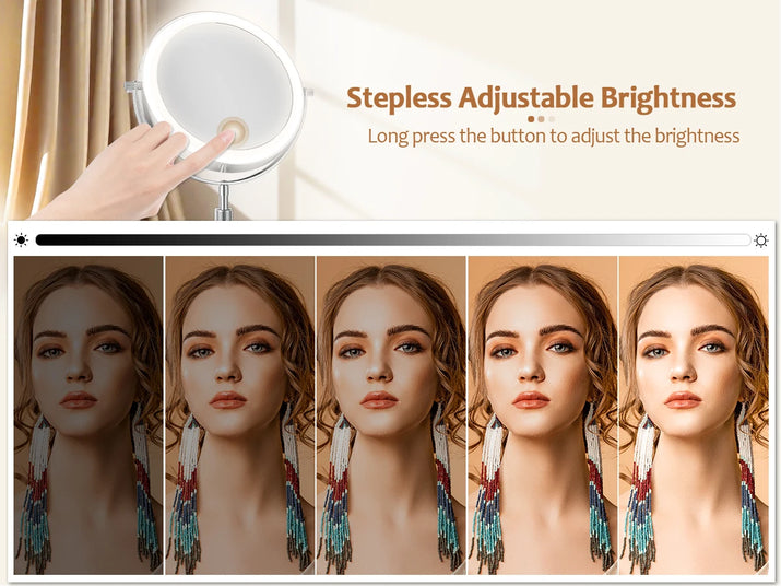 Answer 1: The mirror features three lighting modes: white light, natural light, and warm light, which can be easily switched using a touch sensor. The brightness can also be adjusted through a stepless dimming function, allowing you to find the perfect lighting for your makeup needs in various settings.